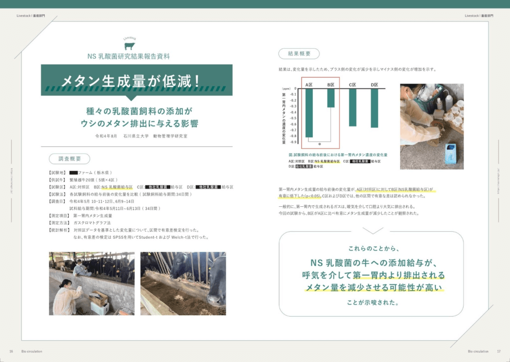 また、弊社が取り扱っている乳酸菌(家畜用 NS 乳酸菌)を含む飼料を活用した栃木県のある繁殖用の雌牛農家様では、メタンガスの削減効果を含む結果を得ることができました。