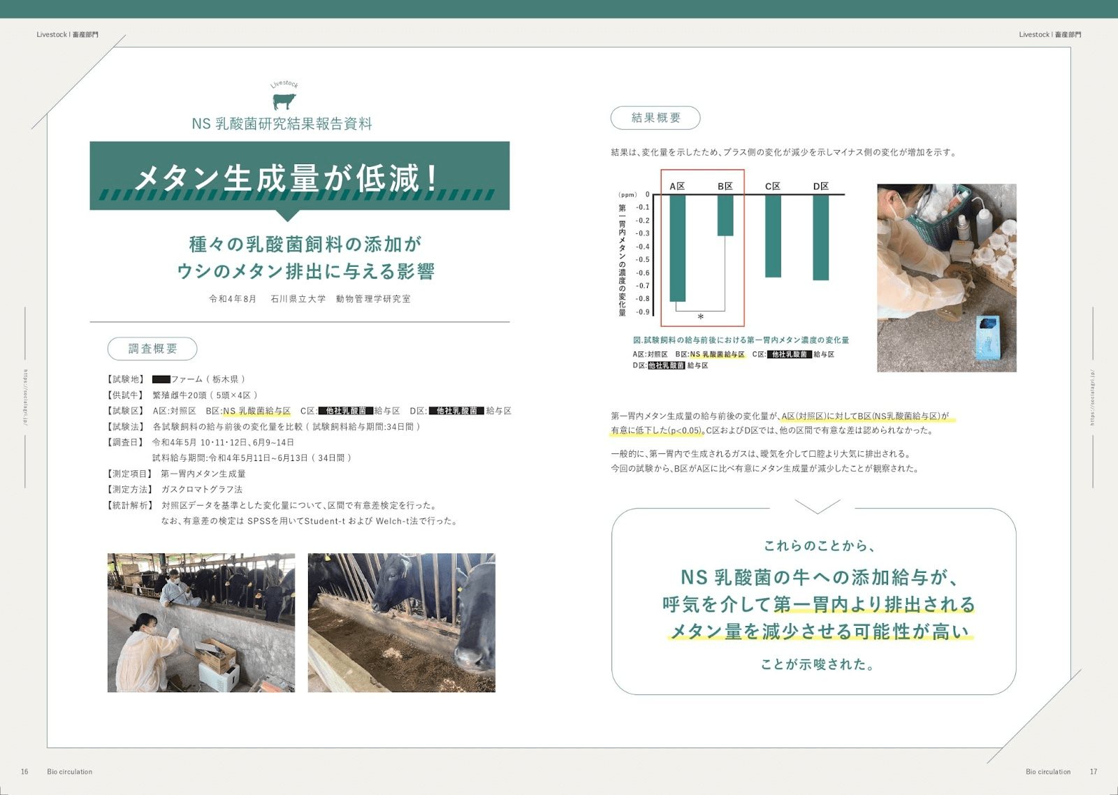 また、弊社が取り扱っている乳酸菌(家畜用 NS 乳酸菌)を含む飼料を活用した栃木県のある繁殖用の雌牛農家様では、メタンガスの削減効果を含む結果を得ることができました。